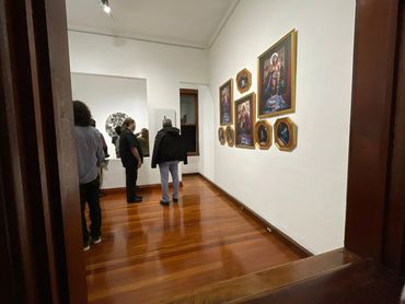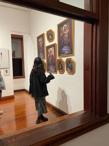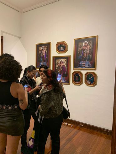 Esos dolores lo reinterpreto como los estigmas que han rodeado y señalado mi cuerpo, nuestros cuerpos desde niña, una figura bíblica representada por una mujer obesa que en lugar de un corazón carga la balanza del peso de su cuerpo apuñalado por lo que lo han señalado